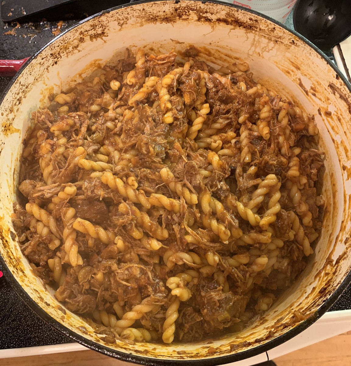 Gemelli with red wine braised pork.