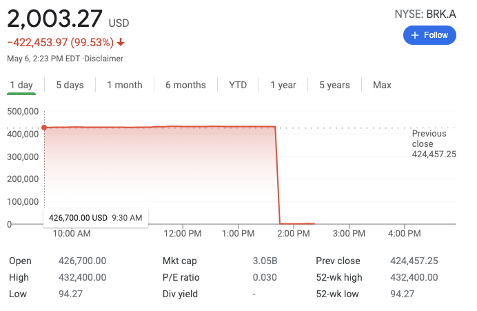 RT @sweis: Berkshire Hathaway just hit $429,496.7295 and now Warren Buffet is broke.