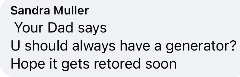 2nd long power outage in 3 years. After this I need to look into solar+power wall type things and/or a generator.
